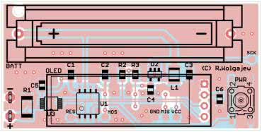 Dalej lutujemy elementy bierne oraz mechaniczne w rodzaju przycisku PWR czy gniazda baterii AAA, a na samym końcu montujemy wyświetlacz OLED (w odpowiedniej odległości od płaszczyzny obwodu drukowanego, czyli na równi z płaszczyzną wyznaczoną przez obrys baterii zasilającej), zwyczajnie lutując jego wyprowadzenia w przeznaczone do tego celu pola lutownicze (należy koniecznie sprawdzić polaryzację zasilania), gdyż połączenia elektryczne zapewniają mu jednocześnie wystarczająco stabilny montaż mechaniczny.
