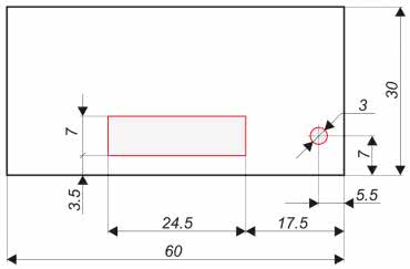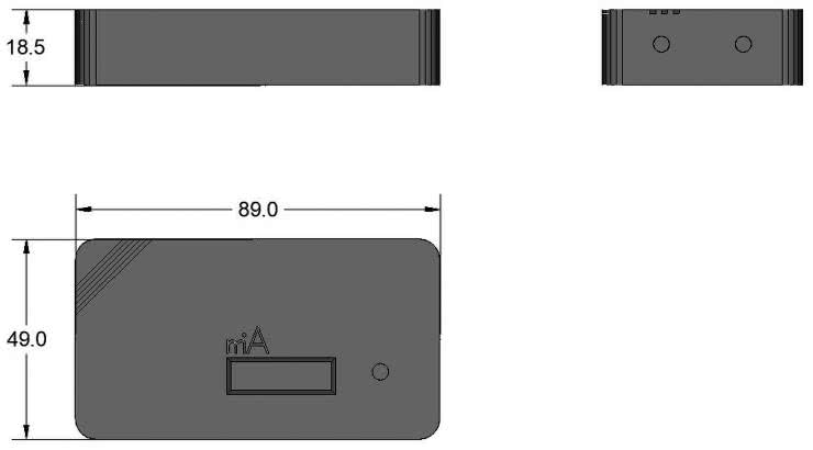 Dla osób, które we własnym zakresie będą chciały wykonać obudowę do urządzenia miA na rysunku 8 pokazano wygląd obwodu drukowanego z zaznaczeniem położenia i wymiarów elementów interfejsu użytkownika (wyświetlacza i przycisku PWR). Wynikowa wysokość zmontowanego urządzenia (z osadzoną w podstawce baterią AAA) wynosi w naszym wypadku około 13 mm.