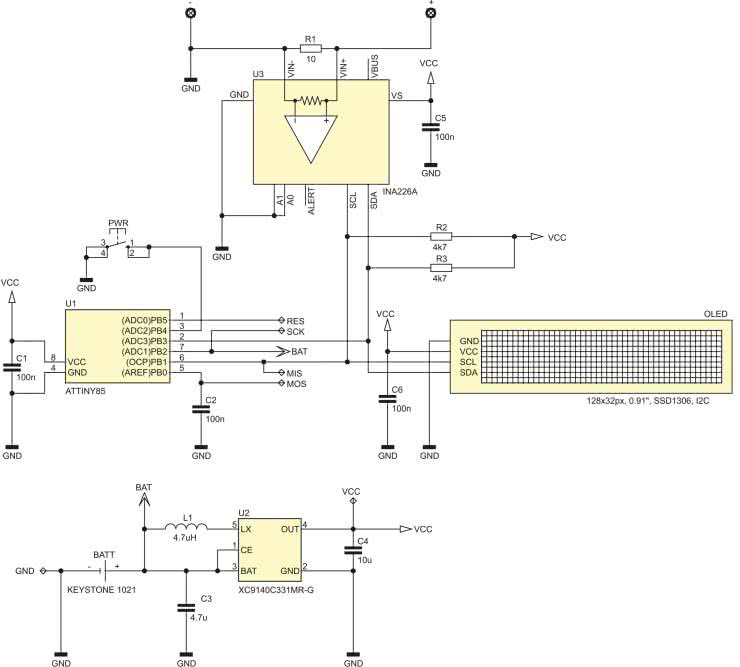 Przejdźmy do schematu ideowego urządzenia miA. który pokazano na rysunku 2. Jak widać, jest to bardzo prosty system mikroprocesorowy, którego sercem jest niewielki mikrokontroler firmy Microchip (dawniej Atmel) typu ATtiny85 taktowany wewnętrznym generatorem RC o częstotliwości 1 MHz, odpowiedzialny za programową implementację interfejsu I²C, przy użyciu którego mikrokontroler realizuje obsługę układu INA226 będącego specjalizowanym, bardzo dokładnym, 16-bitowym, różnicowym przetwornikiem ADC oraz obsługę niewielkiego acz bardzo efektownego wyświetlacza OLED o rozdzielczości 128×32 piksele stanowiącego element graficznego interfejsu użytkownika.