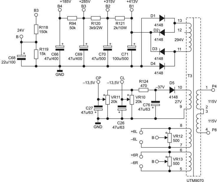 W dzielniku R118, R119 powstaje napięcie B o wartości +24 VDC zablokowane kondensatorem C68. Jest ono stosowane w układzie redukcji przydźwięku o częstotliwości 50 Hz, którego źródłem może być przemienne napięcie żarzenia lamp. Napięcie +24 VDC jest podawane na suwaki wieloobrotowych potencjometrów VR12 i VR13. Ta składowa stała nałożona na przemienne napięcie żarzenia powoduje zmniejszenie potencjału pomiędzy żarnikiem i katodą a tym samym redukuje lub eliminuje przydźwięk 50 Hz. To napięcie można zwiększyć do wartości ok. +50 V zmieniając rezystory dzielnika R118 i R119, gdyby układ redukcji przydźwięku nie był wystarczająco skuteczny.