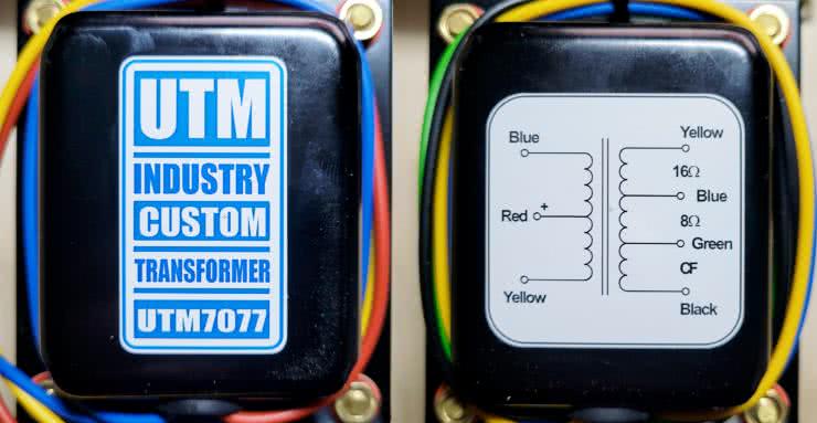 Zastosowany w projekcie transformator jest nietypowy, ponieważ jak już powiedzieliśmy ma dodatkowe odczepy w uzwojeniu wtórnym potrzebne do realizacji ujemnego katodowego sprzężenia zwrotnego. Taki układ jest rzadko spotykany we wzmacniaczach Push-Pull pracujących w klasie AB. Dlatego nie można tutaj zastosować gotowego, uniwersalnego transformatora przeznaczonego do wzmacniaczy Push-Pull z lampami EL84. Bez specjalistycznej wiedzy, osprzętu i umiejętności samodzielne wykonanie transformatora odpowiedniej jakości do naszego wzmacniacza jest bardzo trudne, a w praktyce niemożliwe. Dlatego zastosowano bardzo dobry i co ważne dostępny transformator UTM7077 (fotografia 1). Na tabliczce znamionowej są oznaczone kolory przewodów wyprowadzeń. Powiemy o tym jeszcze przy okazji montażu wzmacniacza i podłączania transformatorów do układu.