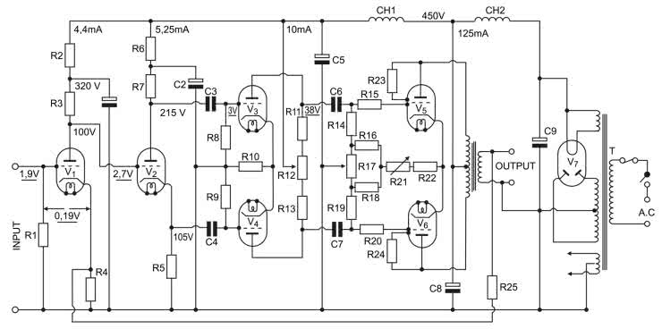 We wzmacniaczu pokazanym na rysunku 2 w stopniu końcowym zastosowano tetrody strumieniowe KT66 i mimo dość wysokiego napięcia anodowego uzyskano moc tylko 2×15 W. Wynika to z małej sprawności klasy A. Z czasem wymagania użytkowników rosły i żeby uzyskać większą moc zaczęto stosować wzmacniacze przeciwsobne pracujące w kasie AB. Topologicznie nie różnią się od wzmacniacza przeciwsobnego Push-Pull pracującego w kasie A. Jedyna różnica to dobór punktu pracy lamp mocy, tak by przy większych sygnałach wzmacniacz przechodził płynnie do pracy w kasie B. Klasa AB ma większa sprawność kosztem niewielkiego wzrostu zniekształceń.