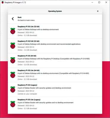 Przed rozpoczęciem pisania programu sterującego konieczne jest zainstalowanie systemu operacyjnego dla komputera Raspberry Pi Zero. Zadanie to ułatwia program Raspberry Pi Imager, który pobrano ze strony https://tiny.pl/c725f. Jest dostępnych wiele wersji systemu operacyjnego, co pokazuje rysunek 2, jednak najbardziej odpowiednia okazała się wersja Raspberry Pi OS (Legancy).