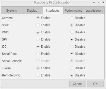 Po zakończeniu instalacji systemu operacyjnego w oknie konfiguracyjnym widocznym na rysunku 3 trzeba włączyć niezbędne interfejsy. Na rysunku 4 zaprezentowano niezwykle przydatne narzędzie, jest to program VNC Viewer, dzięki któremu jest możliwe zdalne połączenie z komputerem Raspberry Pi.