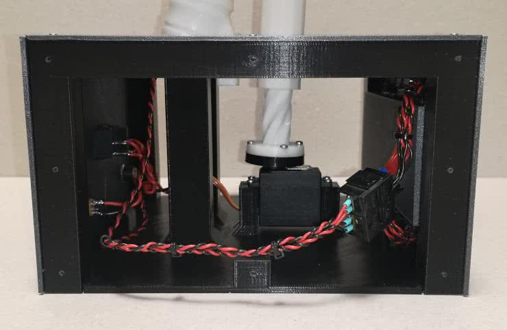 Budowę urządzenia można podzielić na dwie części. Pierwsza część to głowa robota InMoov zbudowana według opisu umieszczonego na stronie https://www.inmoov.fr. Druga część dotyczy elementów dodanych do pierwotnego projektu. Są to elementy montażowe i podzespoły elektroniczne oraz dodatkowo wydrukowane części pokazane na fotografiach 1…3. Aby zmieścić komputer Raspberry Pi oraz sterownik serwomechanizmów w głowie robota, konieczna była zmiana serwomechanizmu HS 805BB typu gigant na serwomechanizm Feetech FI7635M typu standard. Żeby to zrobić, zaprojektowano specjalny adapter zaprezentowany na fotografii 4. Projekty wszystkich dodatkowo zaprojektowanych części można pobrać na stronie https://github.com/ZW-Robotics/Glowa_robota_InMoov_STL. Z kolei uchwyt do przymocowania kamery dla komputera Raspberry Pi jest dostępny na stronie https://www.thingiverse.com/thing:2197719/files.