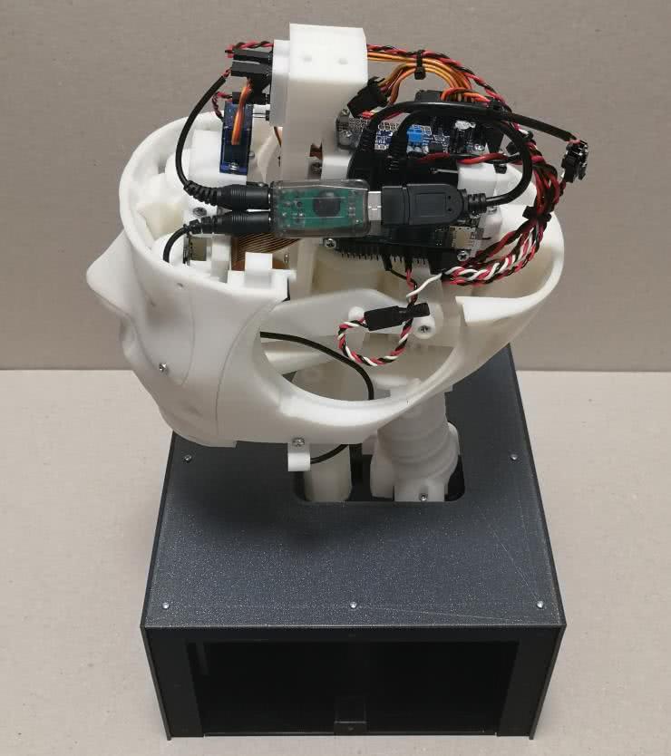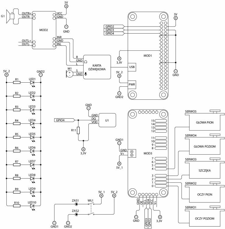 Do komputera Raspberry Pi opisanego jako MOD1, poprzez port microUSB, podłączona jest karta dźwiękowa. Do karty dźwiękowej za pośrednictwem kabli zakończonych wtykami jack 3,5 mm dołączono mikrofon M1 oraz wzmacniacz audio MOD2, z którego wzmocniony sygnał trafia do głośnika G1. Moduł MOD3 jest odpowiedzialny za sterowanie serwomechanizmami SERWO1...5, które poruszają ruchomymi częściami głowy. Układ scalony U1 to czujnik temperatury, który do poprawnej pracy potrzebuje rezystora R11.