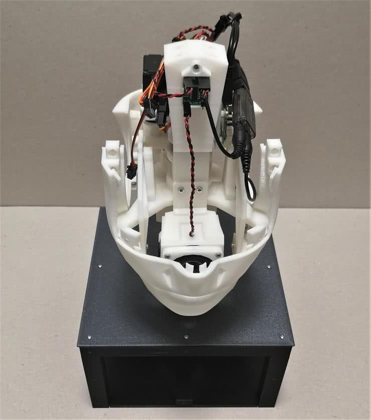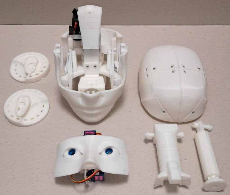 Po pobraniu plików STL ze strony https://www.inmoov.fr można zacząć drukowanie części. Do tego celu zastosowano drukarkę Creality Ender 5 oraz filament PLA. Mając wydrukowane części, niezbędne elementy montażowe oraz podzespoły elektroniczne, możliwy jest wstępny montaż głowy, co zostało pokazane na fotografii 5.