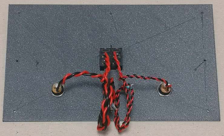 Wszystkie szczegóły zostały uchwycone na fotografiach 6…10. Obwód zasilający sterownik serwomechanizmów wykonano przewodami o przekroju 0,75 mm², pozostałe przewody mają przekrój 0,35 mm². Rezystory ograniczające prąd płynący przez diody LED1…10 zostały przylutowane bezpośrednio do ich dodatnich wyprowadzeń, następnie całość zaizolowano osłoną termokurczliwą. Aby łatwiej było zorganizować przewody, zostały one ze sobą skręcone i spięte opaskami kablowymi.
