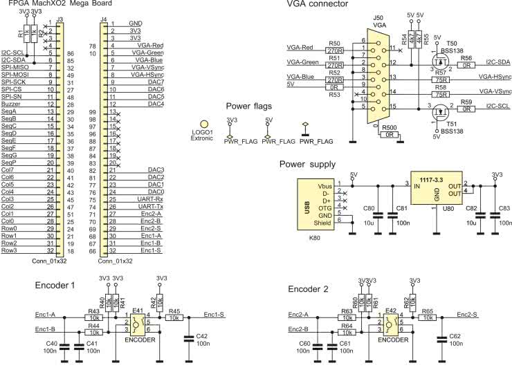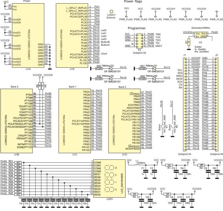 Schemat jest dość podobny do schematu płytki Mini, więc omówimy tylko różnice między mini. Zastosowano układ FPGA to MachXO2-1200 w obudowie TQFP100. Jest on wyposażony w dużo więcej zasobów logicznych niż maluszek z poprzedniej płytki, a także ma zdecydowanie więcej wyprowadzeń.