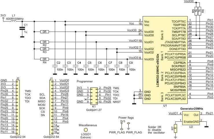 - U1: LCMXO2-256HC-xSG32x (QFN32)