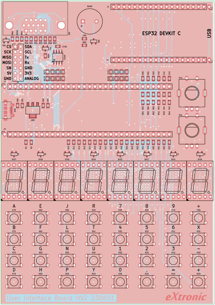 Schemat płytki User Interface pokazano na rysunku 5, a schemat obwodu PCB na rysunku 6. W centralnej części płytki umieszczono duży i czytelny wyświetlacz LED multipleksowany. Składa się z ośmiu wyświetlaczy 7-segmentowych ze wspólną katodą o szerokości 600 mils – czyli tych najbardziej popularnych, które są dostępne we wszystkich kolorach. Obsługa wyświetlacza tego typu została omówiona w 9 odcinku kursu.