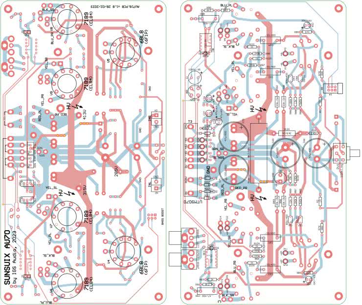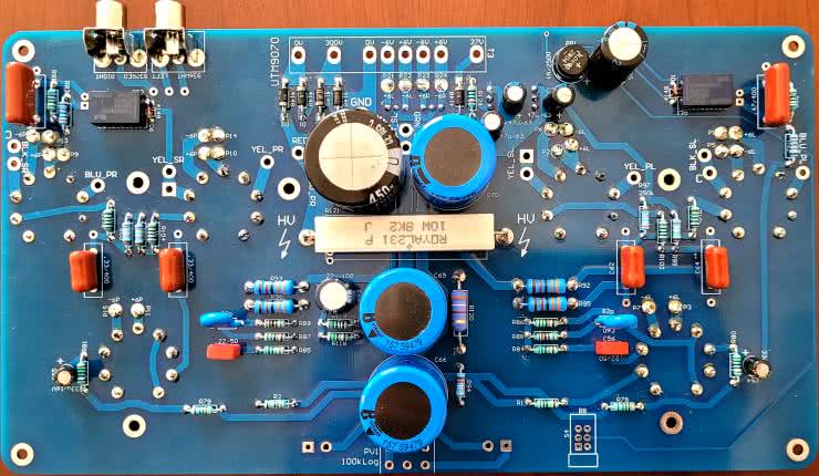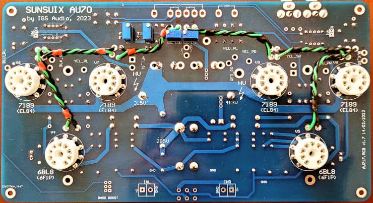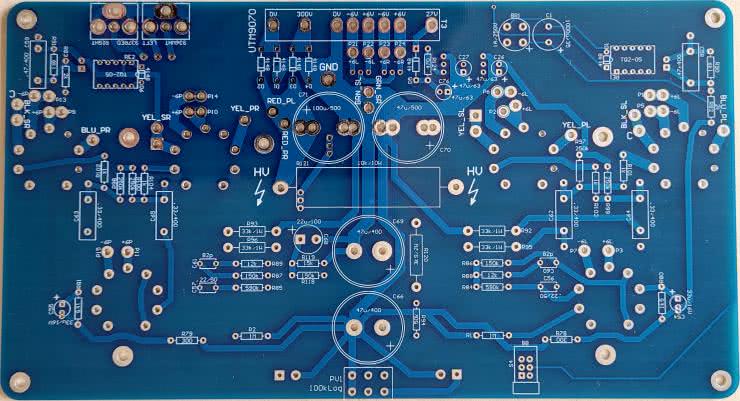 Po wlutowaniu wszystkich elementów na stronie elementów przechodzimy do drugiej strony płytki. Tam montowane są podstawki pod lampy, potencjometry do regulacji biasu i eliminacji przydźwięku, oraz okablowanie układu żarzenia. Należy zwrócić uwagę na równe (proste) wlutowanie podstawek pod lampy.