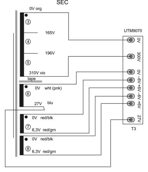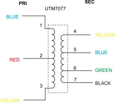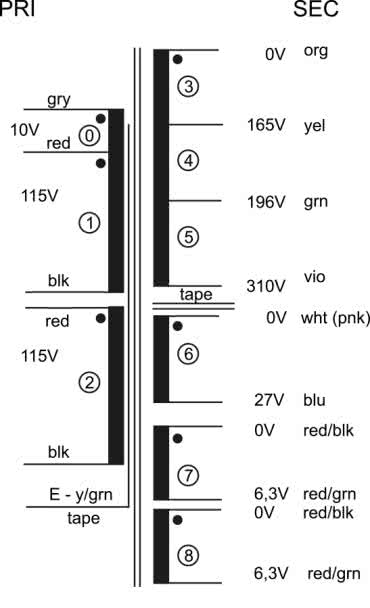 Na rysunku 7 pokazano schemat transformatora z oznaczeniem kolorów przewodów wyprowadzeń uzwojeń pierwotnych (PRI) i wtórnych (SEC).