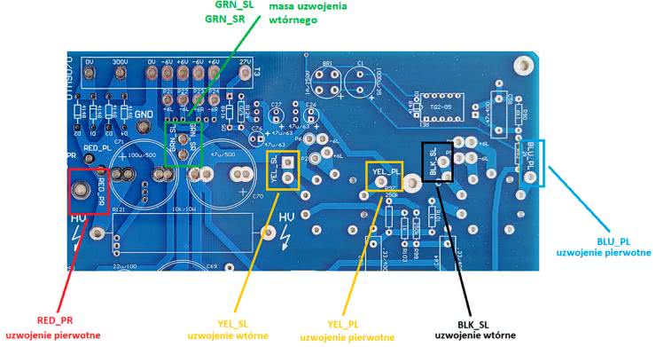 Przy podłączaniu wyprowadzeń do płytki należy zwrócić szczególną uwagę, na to, że kolorem żółtym są oznaczone wyprowadzenia uzwojeń po stronie pierwotnej i po stronie wtórnej, podobnie jest z kolorem niebieskim. Aby ułatwić poprawną identyfikację punktów lutowniczych na płytce wzmacniacza przeznaczonych do podłączenia wyprowadzeń transformatora zostały one opisane według klucza XX_YY, gdzie XX oznacza kod koloru, a YY stronę transformatora i kanał stereo. Na przykład BLU_PL oznacza kolor niebieski (blue), uzwojenie pierwotne (pirimary) i kanał lewy (left), a oznaczenie YEL_SP oznacza kolor żółty, uzwojenie wtórne (secondary) i kanał prawy. Na rysunku 11 pokazano fragment płytki z zaznaczonymi opisami.