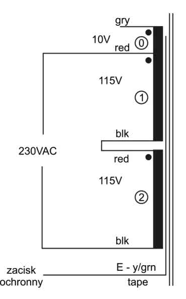 Uzwojenie pierwotne składa się z trzech uzwojeń: dwóch na napięcie 115 V i jednego na napięcie 10 V. Po odpowiednim połączeniu uzwojeń można zasilać transformator napięciem sieciowym o napięciach 115 VAC, 230 VAC i 240 VAC. Nas interesuje zasilanie z sieci 230 VAC. W tym celu trzeba połączyć szeregowo dwa uzwojenia na napięcie 115 V zwracając uwagę na początki i końce uzwojeń. Wyprowadzenie uzwojenia ekranującego podłączamy do zacisku ochronnego wtyczki sieciowej. Połączenie uzwojeń pierwotnych do pracy z napięciem 230 VAC pokazano na rysunku 8.