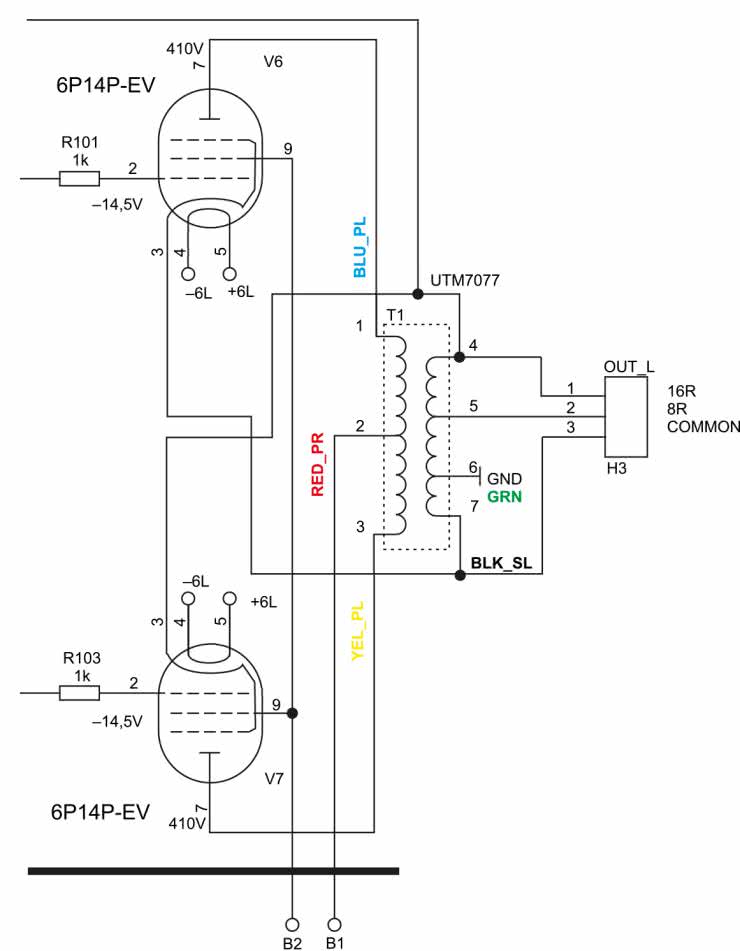 Konieczne jest stosowanie lamp 6P14P w wersji militarnej na przykład serii EV. Zwykłe lampy 6P14P jak i EL84 nie są przystosowane do pracy z napięciem anodowym +400 V i jeżeli się nie uszkodzą natychmiast to nie popracują długo w tym układzie. Można próbować obniżyć napięcie anodowe lamp mocy poniżej 300 VDC i godząc się na niższą moc wyjściową stosować lampy EL84. My takich testów nie robiliśmy.