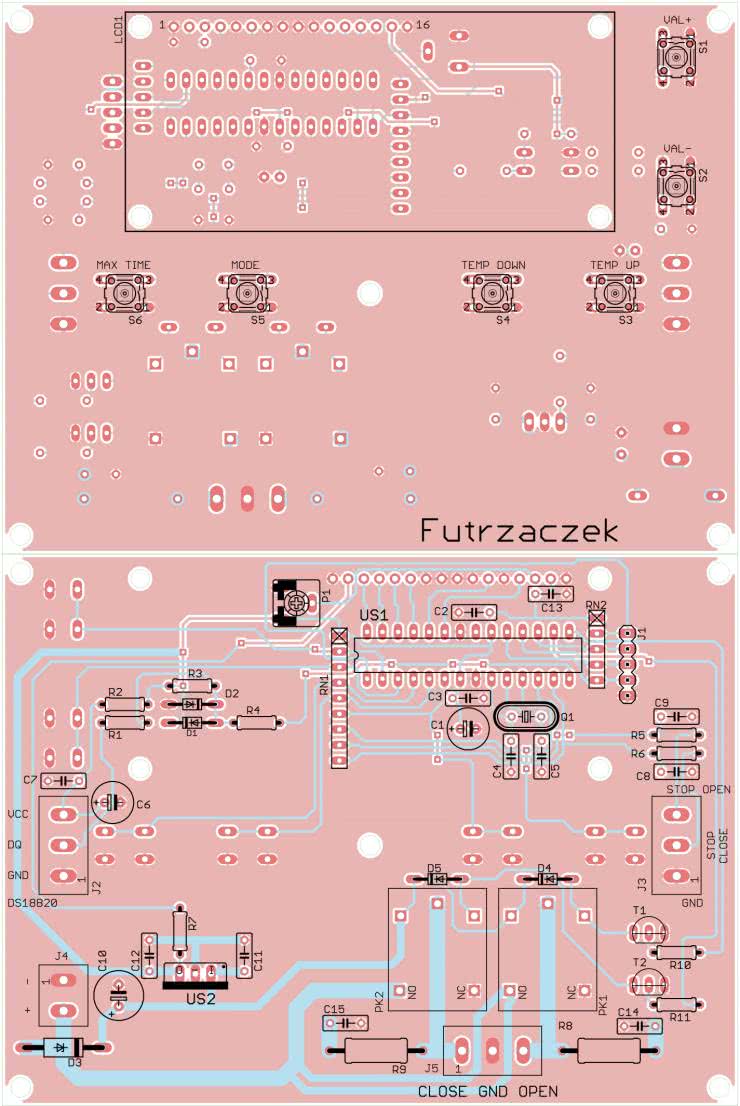 Do zacisków złącza J2 należy podłączyć czujnik typu DS128B20, zgodnie z opisami na płytce. Może to być gotowy moduł z dołączonymi przewodami, w którym czujnik został hermetycznie zaciśnięty w metalowej rurce.