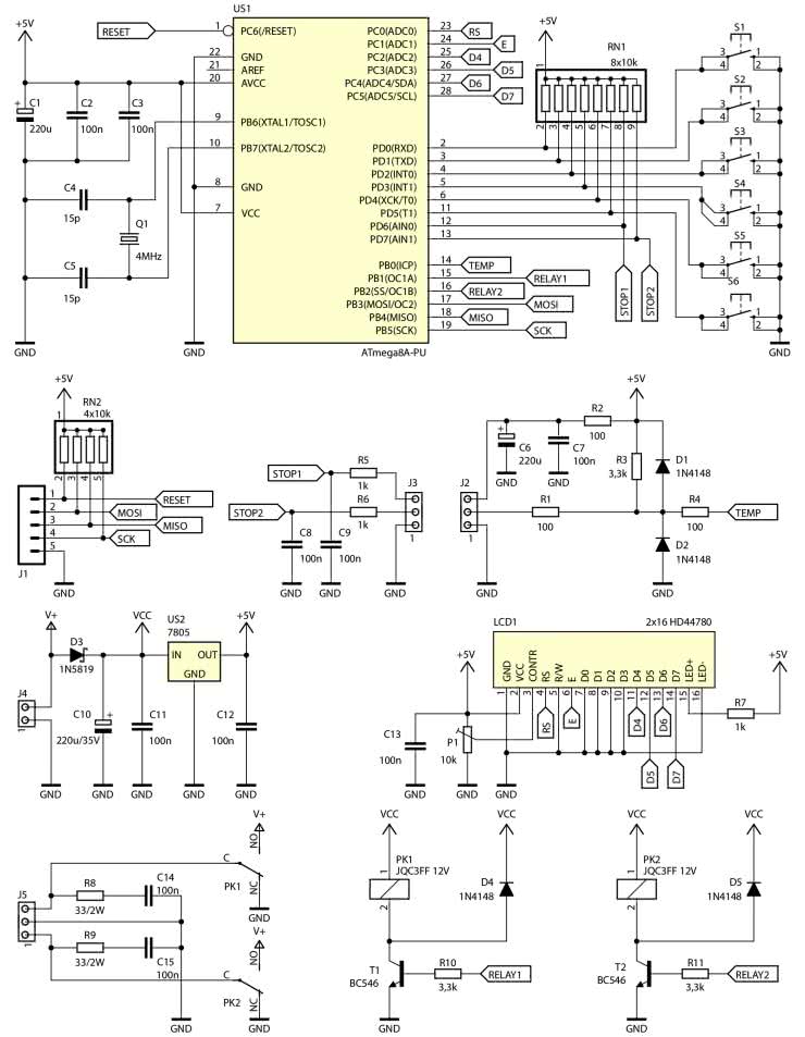 Napięcie zasilające układ podłącza się do zacisków złącza J4. Dioda D1 odcina zasilanie w przypadku niewłaściwej polaryzacji napięcia. Stabilizator liniowy typu 7805 dostarcza napięcia 5 V dla układów cyfrowych. Moc strat na nim jest na tyle niska, że nie ma potrzeby stosowania przetwornicy impulsowej. Na silnik trafia napięcie zasilające układ, toteż trzeba je dostosować do wymagań silnika. Po wymianie przekaźników na inne modele, układ oraz współpracujący z nim silnik mogą być zasilane napięciem 24 V.
