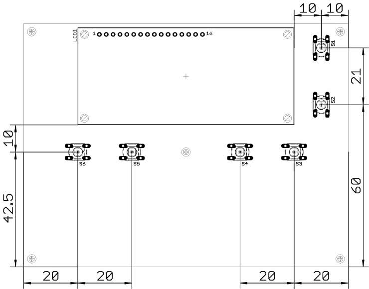 Na drugiej stronie płytki jest miejsce dla wyświetlacza LCD1 oraz sześciu przycisków S1…S6. Ich lokalizację po przylutowaniu pokazuje fotografia tytułowa. Na samym końcu, po wlutowaniu wszystkich przycisków, należy przykręcić wyświetlacz LCD za pomocą czterech tulei dystansowych oraz przylutować jego złącza. Warto lutowanie zostawić na sam koniec, po przykręceniu, aby ewentualny naddatek wysokości tulei mógł być skompensowany przez lekkie wystawanie złączy z powierzchni płytki – by część męska i żeńska wchodziły w siebie całkowicie. Rozmieszczenie przycisków i wyświetlacza na powierzchni płytki zostało pokazane na rysunku 4, dzięki niemu można łatwiej wykonać obudowę dla tego urządzenia.