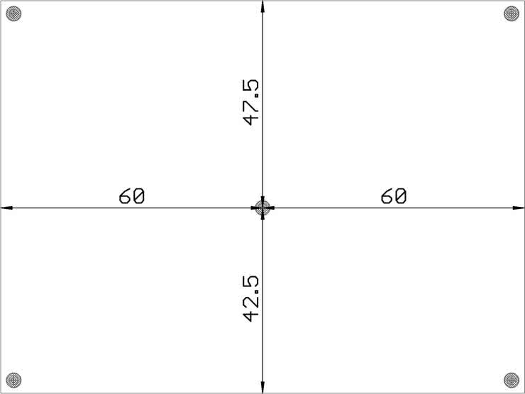 Układ został zmontowany na dwustronnej płytce drukowanej o wymiarach 120×90 mm. Jej schemat został pokazany na rysunku 2. W odległości 3 mm od krawędzi płytki znalazły się cztery otwory montażowe, każdy o średnicy 3,2 mm. Dodatkowo, aby płytka nie uginała się podczas naciskania przycisków, w pobliżu środka płytki dodano otwór. Rysunek 3 pokazuje jego lokalizację na płytce.