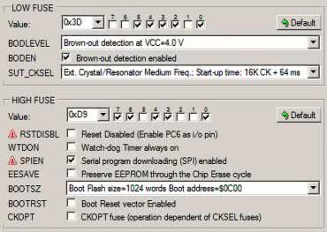 Na etapie uruchamiania konieczne jest zaprogramowanie pamięci Flash mikrokontrolera dostarczonym wsadem oraz zmiana jego bitów zabezpieczających. Oto ich nowe wartości: