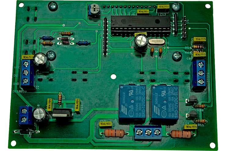 Poprawnie zaprogramowany układ jest gotowy do działania po ustawieniu kontrastu wyświetlacza potencjometrem P1. Do zasilania powinno służyć napięcie stałe o wartości około 12 V, a dokładniej z przedziału 10...16 V. Takie granice uwzględniają zakres prawidłowej pracy przekaźników (z uwzględnieniem spadku napięcia na diodzie D3 i tranzystorach T1 oraz T2) w temperaturze 20°C. Warto, aby owe napięcie było dobrze filtrowane, a najlepiej stabilizowane. Pobór prądu przy 12 V wynosi około 15 mA przy wyłączonych przekaźnikach oraz około 30 mA, kiedy cewka jednego z nich zostanie załączona. Do tego należy dodać pobór prądu przez sam silnik, który nie powinien przekraczać 4 A z uwagi na wytrzymałość ścieżek. Typowe elektrozawory dostępne na rynku pobierają prąd o natężeniu około 1 A, więc taki zapas jest całkowicie wystarczający.
