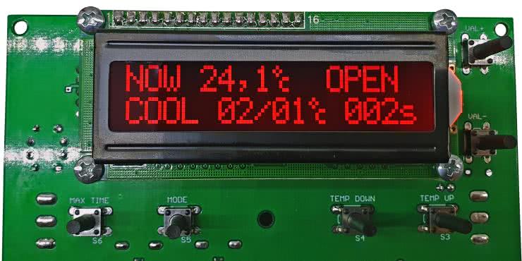 Widok ekranu działającego urządzenia jest widoczny na fotografii 2. Aktualna temperatura (górny wiersz) jest wskazywana z rozdzielczością 0,1°C w zakresie –9,9…+99,9°C i z rozdzielczością 1°C poza tym przedziałem. Błąd komunikacji z czujnikiem jest wskazywany napisem ERR! w tym miejscu, przy okazji zatrzymuje on układ i sprowadza zawór do pozycji zamkniętej. Po prawej stronie górnego wiersza jest stan zaworu: OPEN (otwarty) lub CLOSE (zamknięty); jeżeli stan ulega zmianie, wówczas ten tekst miga.