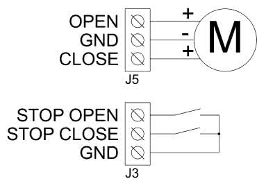 W złączu J3, między GND a STOP OPEN, powinien być włączony ten wyłącznik krańcowy, który ulegnie zwarciu po całkowitym otwarciu zaworu. Z kolei między GND i STOP CLOSE należy włączyć ten, który wykryje całkowite zamknięcie zaworu. Silnik, podłączony do zacisków złącza J5, powinien mieć trzy wyprowadzenia: jeden wspólny zacisk masy i dwa zaciski dodatnie, służące ruchowi w kierunku otwarcia (OPEN) i zamknięcia (CLOSE) zaworu.