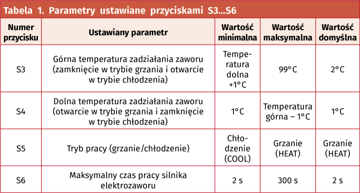 Rolą termostatu jest utrzymanie temperatury danego obiektu w zadanych granicach. Metody są różne: elektryczne grzałki, dmuchawy chłodzące, ogniwa Peltiera lub pompy ciepła. Najistotniejsze jest to, że wyjście termostatu jest dwustanowe – sterowany obwód może być załączony lub wyłączony, bez stanów pośrednich. Zaprezentowany układ, w odróżnieniu od znanych na rynku rozwiązań, jest przystosowany do sterowania przepływem cieczy, która ochładza lub ogrzewa kontrolowany obiekt. Może sterować elektrozaworem, w którym znajduje się elektryczny silnik prądu stałego, umożliwiając lub blokując przepływ czynnika. Odpowiednie zarządzanie pracą takiego silnika pozwoli na jego bezawaryjną pracę przez długie lata. Co równie ważne, zadawanie odpowiednich nastaw jest banalnie proste, zatem nie trzeba być mistrzem elektroniki, aby opisanego termostatu z powodzeniem używać.