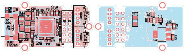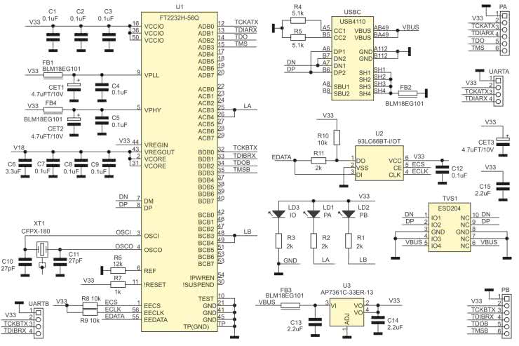 Układ FT2232H pełni funkcje dwukanałowego konwertera USB, a realizowana funkcja konfigurowana jest oprogramowaniem FT_Prog i zapisywana w pamięci nieulotnej typu 93LC66B. Każdy z kanałów może zostać skonfigurowany niezależnie, co umożliwia realizację kanałów JTAG i UART przydatnych zarówno do programowania jak i testowania aplikacji. FT2232H pracuje w typowej aplikacji zasilanej z portu USB.