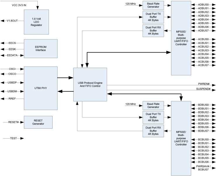 Konwerter zawiera układ FT2232H, którego budowę we wewnętrzną pokazuje rysunek 1.