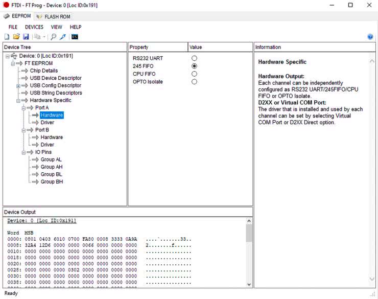 Jeżeli chcemy użyć interfejsu MPSSE, musimy uruchomić konfigurator FT_prog.exe (rysunek 4) i zmienić konfigurację (PortX\Hardware) z RS232UART na 245FIFO oraz aktywować driver D2XX (PortX\Driver). Warto ustawić maksymalny pobierany prąd z USB na 500 mA i zwiększyć wydajność GPIO do 16 mA.