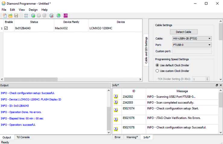 Należy jednak pamiętać o wyborze kanału FTUSB-0. Po podłączeniu portu A konwertera z interfejsem JTAG układu i inicjacji łańcucha JTAG można wykryć podłączony układ, w tym przypadku LCMXO2-1200HC i używać programatora jak „fabrycznego”. Kanału UART można użyć do komunikacji z aplikacją docelową.