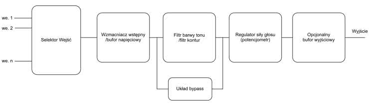 Na rysunku 1 pokazano schematycznie budowę klasycznego przedwzmacniacza audio. Układ ma do spełnienia kilka ważnych funkcji: