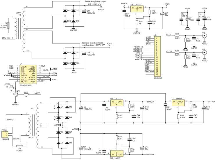 Układ zasilania jest dość rozbudowany. Źródłem napięć przemiennych są dwa transformatory. Pierwszy transformator T1 dostarcza dwu symetrycznych napięć przemiennych o wartości +12 VAC przy obciążeniu 500 mA przeznaczonych dla sekcji analogowej zasilacza. Ta sekcja zasilacza dostarcza napięć symetrycznych ±12 V i napięcia +7 VA. Napięcia symetryczne są stosowane do zasilania wszystkich wzmacniaczy operacyjnych w układzie i części analogowej układu PGA2320.
