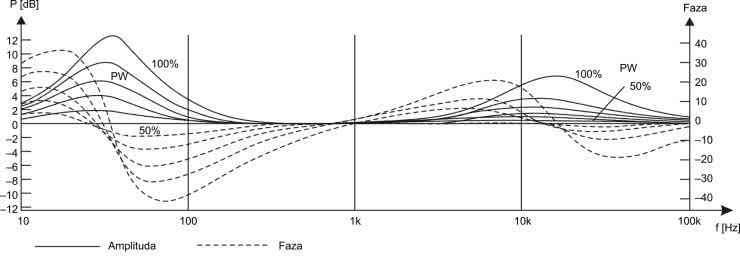 Na rysunku 5 pokazano charakterystyki amplitudowo-fazowe regulatora. Układ wprowadza wyjątkowo małe przesunięcia fazowe nieprzekraczające 40° dla 50 Hz. Regulacja tonów niskich wynosi ±12 dB dla 30 Hz i ±6,5 dB dla 15 kHz. Jak widać na rysunku 5, sygnał po osiągnięciu maksymalnego podbicia dla tonów niskich zaczyna opadać, kiedy częstotliwość dalej maleje. Podobnie jest z wysokimi częstotliwościami. Po osiągnięciu maksymalnego podbicia dla 15 kHz i przy dalszym wzroście częstotliwości amplituda zaczyna również opadać. Poza tym w zakresie częstotliwości od 150 Hz do 3 kHz sygnał amplitudowo i fazowo jest modyfikowany w minimalnym stopniu. Dlatego układ działa subtelnie i dźwięk jest bardzo dobrej jakości. Wyjście filtra nie powinno być obciążane wejściem o małej impedancji, ponieważ zmieni to charakterystyki amplitudowo-fazowe filtra.