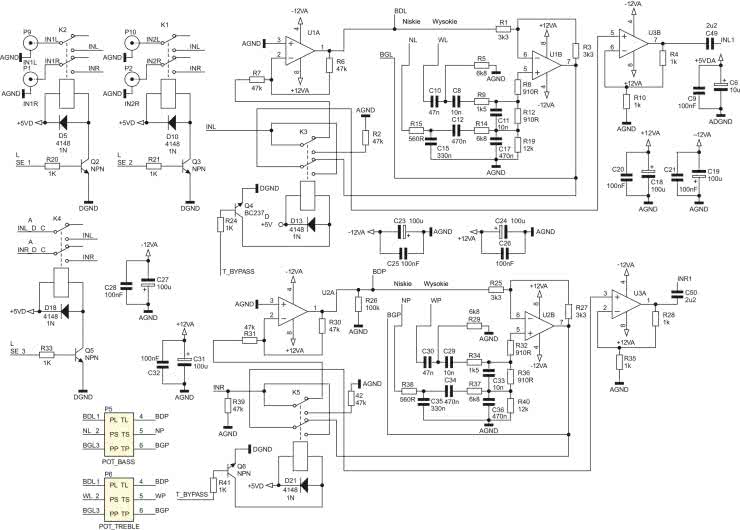 Wróćmy na chwilę do rezystora R2. Jego dołączenie do INL w stanie ominięcia regulatorów powoduje, że impedancja wejściowa ma ok. 47 kΩ. Taką samą impedancję wejściową ma wzmacniacz odwracający U1A włączony w tor regulatora barwy. Mamy więc w obu stanach przy aktywnym i nieaktywnym układzie bypass mniej więcej taką samą impedancję wejściową 47 kΩ obciążającą źródła sygnału.