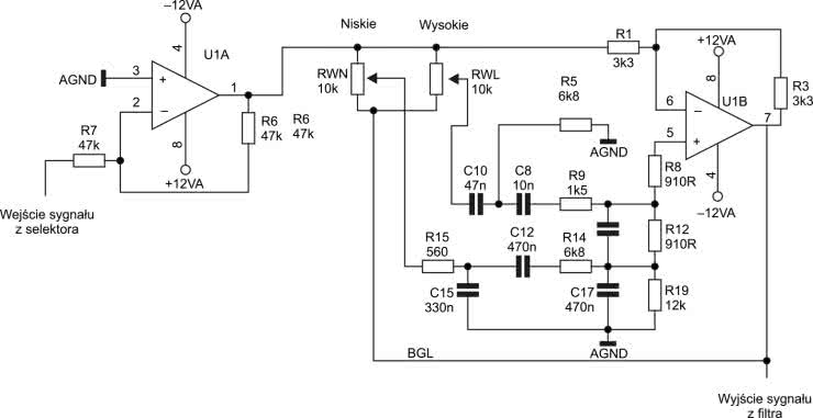Schemat regulatora barwy został pokazany na rysunku 4. Jak już wiemy, sygnał jest najpierw podawany na wzmacniacz odwracający na układzie wzmacniacza operacyjnego U1A. Ten wzmacniacz ma do wykonania dwie funkcje. Zastosowany tu właściwy układ filtra na wzmacniaczu U1B pracuje poprawnie pod warunkiem, że źródło sygnału ma niską impedancję wyjściową. Wzmacniacz U1A zapewnia spełnienie tego warunku. Druga funkcja to odwracanie fazy sygnału o 180°. Jest to niezbędne, ponieważ układ filtra bazuje na wzmacniaczu odwracającym. Sumarycznie cały tor filtra barwy tonu nie ma przesunięcia w fazie. Zapewnia to zgodność fazową toru, kiedy układ filtrów jest włączony i kiedy jest wyłączony. Oczywiście jeżeli pominiemy w rozważaniach nieuniknione przesunięcie fazowe samego filtra.