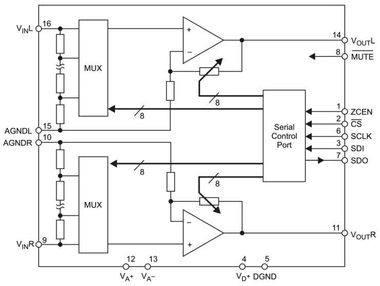 Na wejściu układu PGA2320 są włączone rezystory tworzące dzielnik tłumiący sygnał w zakresie od -95,5 dB do -0,5 dB. Rezystory są łączone przez macierz kluczy analogowych załączanych i wyłączanych przez wewnętrzne układy logiczne. PGA2320 nie jest tylko funkcjonalnym odpowiednikiem potencjometru. Oprócz tłumienia może również wzmacniać sygnał od +0,5 dB do +23,5 dB. Jeżeli skorzystamy z tej właściwości, to nie jest potrzebny dodatkowy układ wzmacniający, oczywiście jeżeli jest to konieczne. W praktyce PGA pracujący jako wzmacniacz może się stać przyczyną wzrostu poziomu szumów.