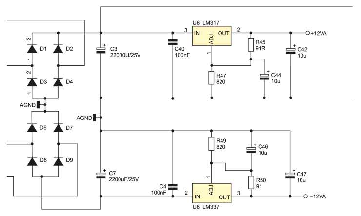 Układ jest klasyczny, jego schemat został pokazany na rysunku 11. Napięcie przemienne jest prostowane w mostku Greatza i filtrowane kondensatorem elektrolitycznym 2200 µF/25 V. Stabilizatorem napięcia dodatniego jest popularny stabilizator LT317 w wersji niskoszumnej, a napięcia ujemnego stabilizator LT337 również w wersji niskoszumnej. Tantalowy kondensator C44 (C46) o pojemności 10 µF znacznie poprawia współczynnik tłumienia tętnień na wyjściu (ripple rejection). Według noty katalogowej LT317 A bez kondensatora ten współczynnik wynosi 65 dB, a po jego zastosowaniu wzrasta do typowej wartości 80 dB, co jest już bardzo dobrym wynikiem. Trochę gorzej jest z popularną wersją LT317, ponieważ tam ten współczynnik z kondensatorem ma średnią wartość 64 dB (nota katalogowa TI).
