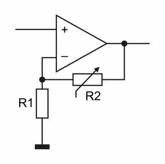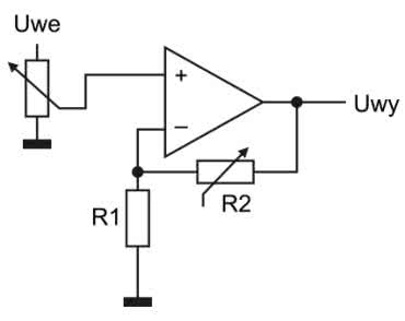 Schemat obwodu z PGA2320 został pokazany na rysunku 8. W torze sygnałowym PGA2320 jest umieszczony wzmacniacz operacyjny pracujący w konfiguracji wzmacniacza nieodwracającego. Wzmocnienie takiego układu wynosi G=1+R2/R1 (rysunek 9).