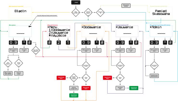 Tryb administratora włączamy/wyłączamy (cyklicznie) z kolei za każdym razem wprowadzenia kodu administratora lub wczytania karty administratora, co sygnalizowane jest pojawieniem się ikonki klucza na ekranie graficznego interfejsu użytkownika. Po wejściu w tryb administratora dostępne mamy następujące opcje: dodawanie kodu/karty RFID/NFC użytkownika (wywoływane poprzez naciśnięcie przycisku "1"), usuwanie kodu/karty RFID/NFC użytkownika (wywoływane poprzez naciśnięcie przycisku "2") oraz wyjście do ekranu głównego (wywoływane poprzez naciśnięcie przycisku "#").
