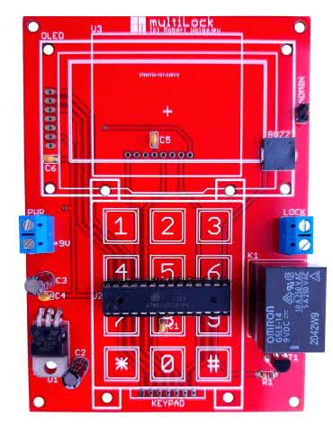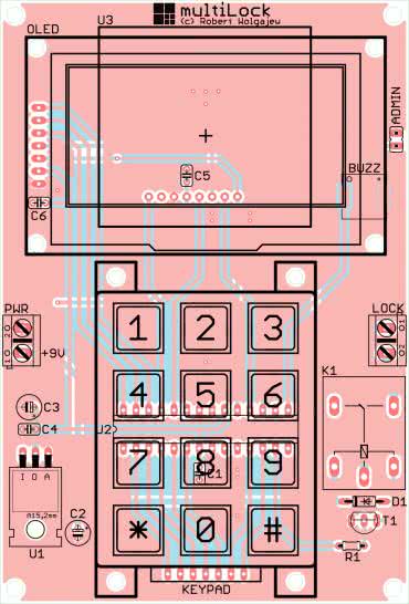 Na fotografii 1 pokazano wygląd obwodu drukowanego urządzenia multiLock tuż przed przylutowaniem modułu RFID, wyświetlacza OLED i klawiatury matrycowej (w wersji prototypowej, przed wprowadzeniem drobnych poprawek w zakresie położenia elementów).