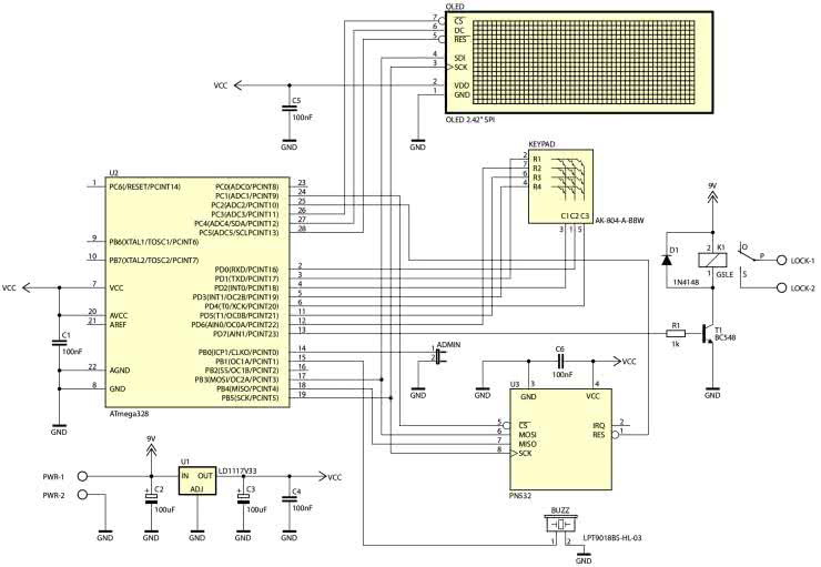 Wróćmy zatem ponownie do naszego schematu ideowego. Mikrokontroler poza zadaniami wspomnianymi powyżej realizuje obsługę klawiatury matrycowej stanowiącej element interfejsu użytkownika, jak i obsługę buzzera piezoelektrycznego niewyposażonego w zintegrowany generator, a to dzięki wykorzystaniu wbudowanego w mikrokontroler układu czasowo-licznikowego Timer1 pracującego w trybie CTC i generującego przebieg o częstotliwości 4 kHz na wyprowadzeniu PB1 (OC1A) układu. Ponadto serce naszego systemu steruje pracą przekaźnika K1 (poprzez stopień tranzystorowy T1), który w zamierzeniach sterować ma elektromechanicznym ryglem pozwalającym na dostęp do chronionego obiektu, jak i obsługuje zworkę ADMIN, zadaniem której jest wprowadzenie systemu multiLock w tryb wprowadzania kodu/karty RFID/NFC administratora.