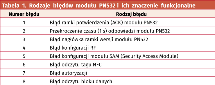 I na koniec jeszcze jedna, istotna informacja. Uruchamianiu urządzenia multiLock towarzyszy inicjalizacja wbudowanego modułu czytnika kart RFID/NFC. Jest to proces dość skomplikowany i jeśli zakończy się z jakiegoś powodu niepowodzeniem (np. nie ustawiliśmy na module odpowiedniego interfejsu komunikacyjnego), to stosowne informacje wraz z kodem błędu pokazane zostaną w ramach graficznego interfejsu użytkownika, zaś samo urządzenie przejdzie do trybu bezczynności (nie będzie można go użytkować). Obsługiwane kody błędów wraz z ich znaczeniem opisano w tabeli 1.