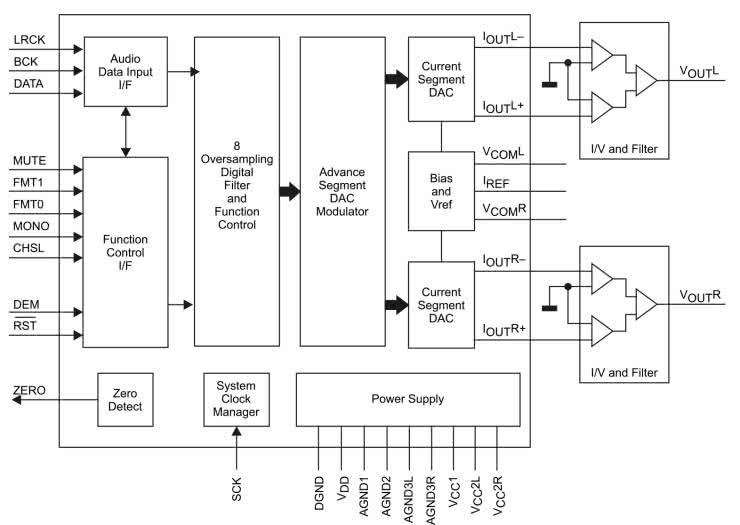 Schemat blokowy przetwornika jest pokazany na rysunku 13. Dane z interfejsu szeregowego są 8-krotnie nadpróbkowane w cyfrowym filtrze dolnoprzepustowym. Pozwala to uprościć analogowy dolnoprzepustowy filtr rekonstruujący, ponieważ może mieć szersze pasmo przepustowe i łagodną charakterystykę opadania.