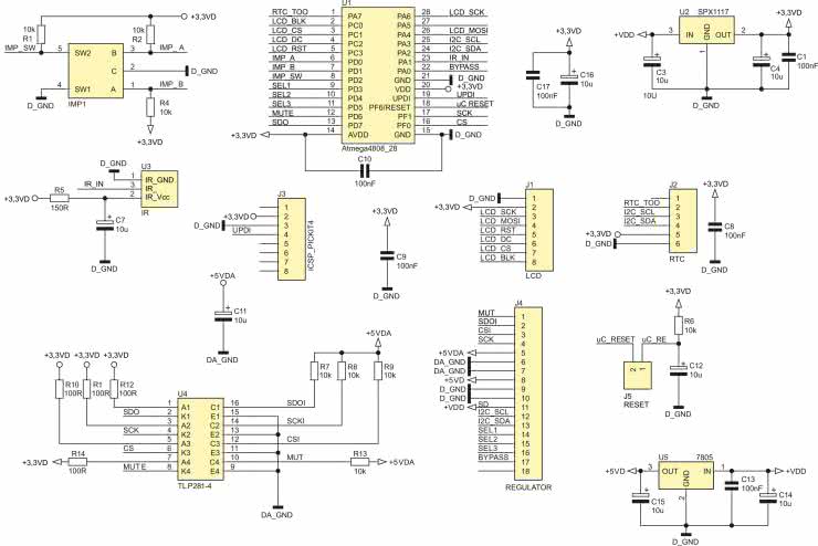 W konsekwencji masy DA_GND i D_GND nie są ze sobą galwanicznie połączone. Optoizolacja i izolacja na przekaźnikach powoduje, że uciążliwe zakłócenia generowane przez cyfrowe układy mikrokontrolera i sterownika wyświetlacza nie przedostaną się przez wspólną masę do układów analogowych.