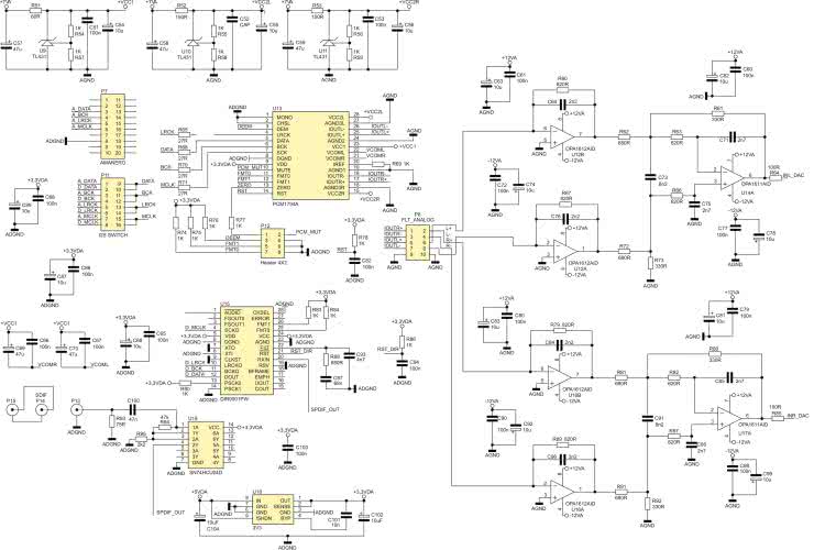 Układ przetwornika analogowo-cyfrowego jest zbudowany na bazie scalonego przetwornika PCM1794A wraz z układami zasilającymi, układu konwertera prąd/napięcie oraz układu rekonstruującego filtra dolnoprzepustowego. Schemat tej części przedwzmacniacza został pokazany na rysunku 12. Oprócz układu przetwornika umieszczono tu też odbiornik S/PDIF i złącze do podłączenia interfejsu USB/I²S.