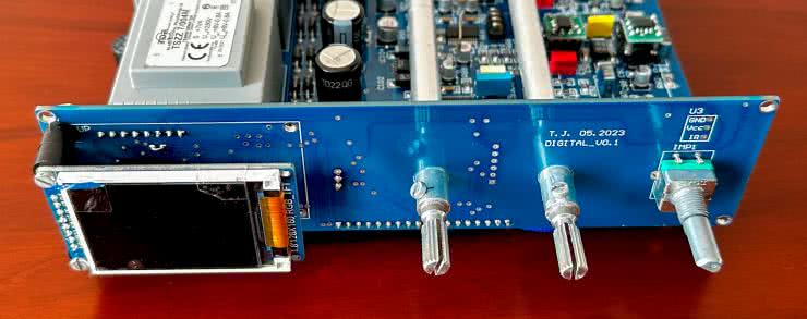 Jeżeli napięcia są prawidłowe w obu płytkach, to w kolejnym kroku trzeba zaprogramować mikrokontroler. Ja do tego celu użyłem środowiska Microchip MPLAB X IDE i programatora/debuggera PicKit4. To naturalny wybór, bo program sterujący został napisany w tym środowisku i skompilowany bezpłatną wersją kompilatora MPLAB CX8. Do zaprogramowania przewidziano złącze J3 z wyprowadzeniami zgodnymi z PicKit 4. Oczywiście można tu użyć innych narzędzi do programowania układów ATmega, na przykład MPLAB IPE z PicKit4 lub narzędzi zaprojektowanych przez firmę Atmel. Do programowania w układzie potrzebne są napięcia zasilające (detekcja ich obecności) i dwukierunkowa linia UPDI. Po prawidłowym zaprogramowaniu mikrokontrolera na ekranie wyświetlacza pojawią się domyślne ustawienia siły głosu, wybranego wejścia selektora i ustawienia układu bypass dla filtra barwy tonu.