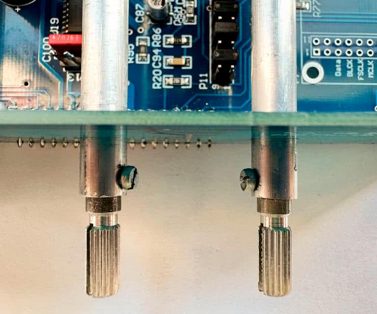 Po zlutowaniu całej płytki jeszcze raz sprawdzamy dokładnie połączenia i łączymy obie płytki za pomocą listwy kątowych goldinów. Złącza łączące obie płytki są tak umieszczone, żeby przygotowane otwory podpierające przedłużacze pasowały do osi potencjometrów. Osie przedłużaczy i oś enkodera są umieszczone w jednej linii i w równych odstępach ok. 3 cm między sobą - fotografia 3.